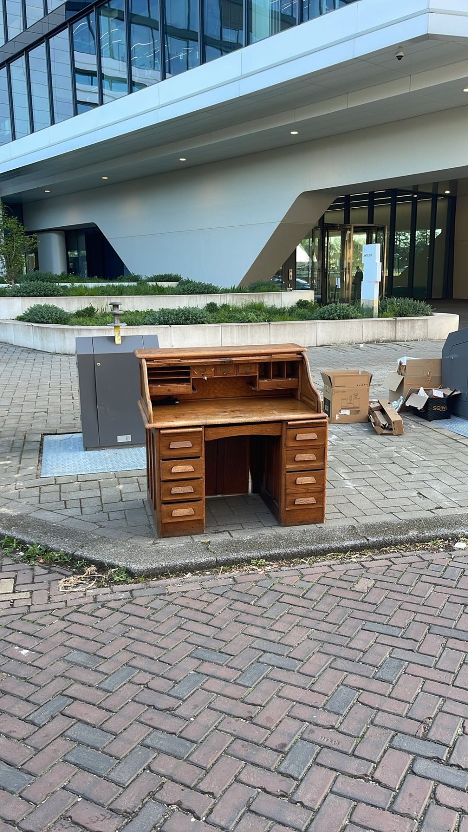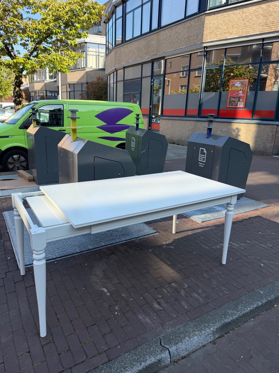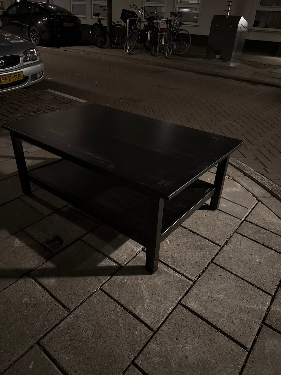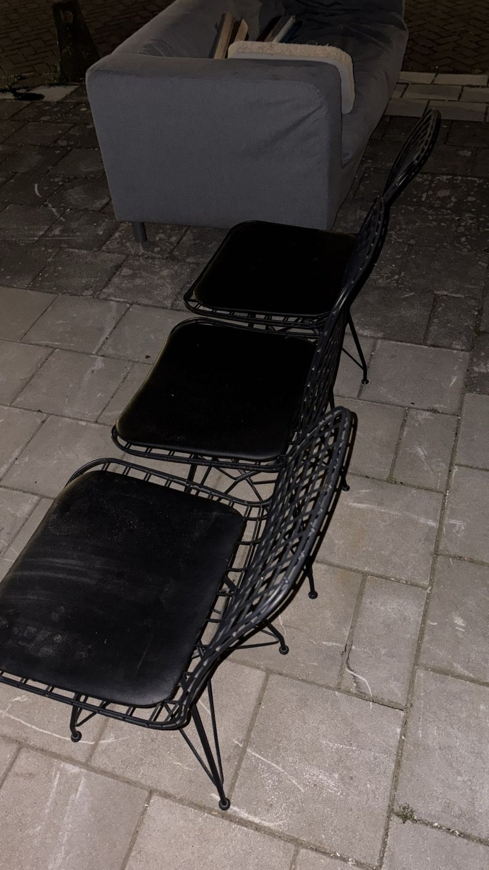 Twee-en-halfzitsbank (195 cm breed) gemêleerde antracietkleurige stof, met brede armleuningen en verchroomd stalen onderstel, met brandplek bij rechterleuning. Aan de straat op Bucheliusstraat 12 in Tuinwijk, Utrecht