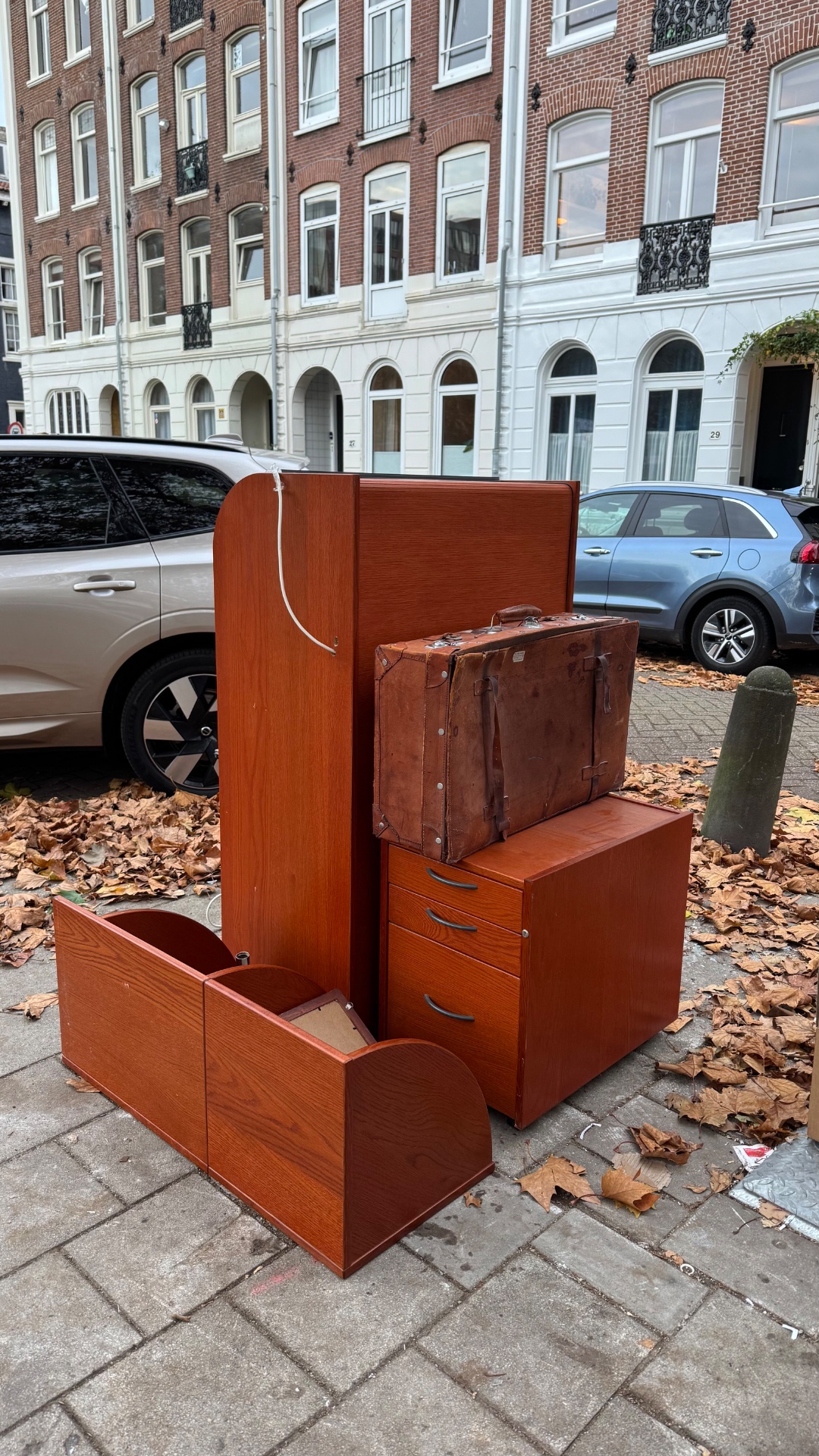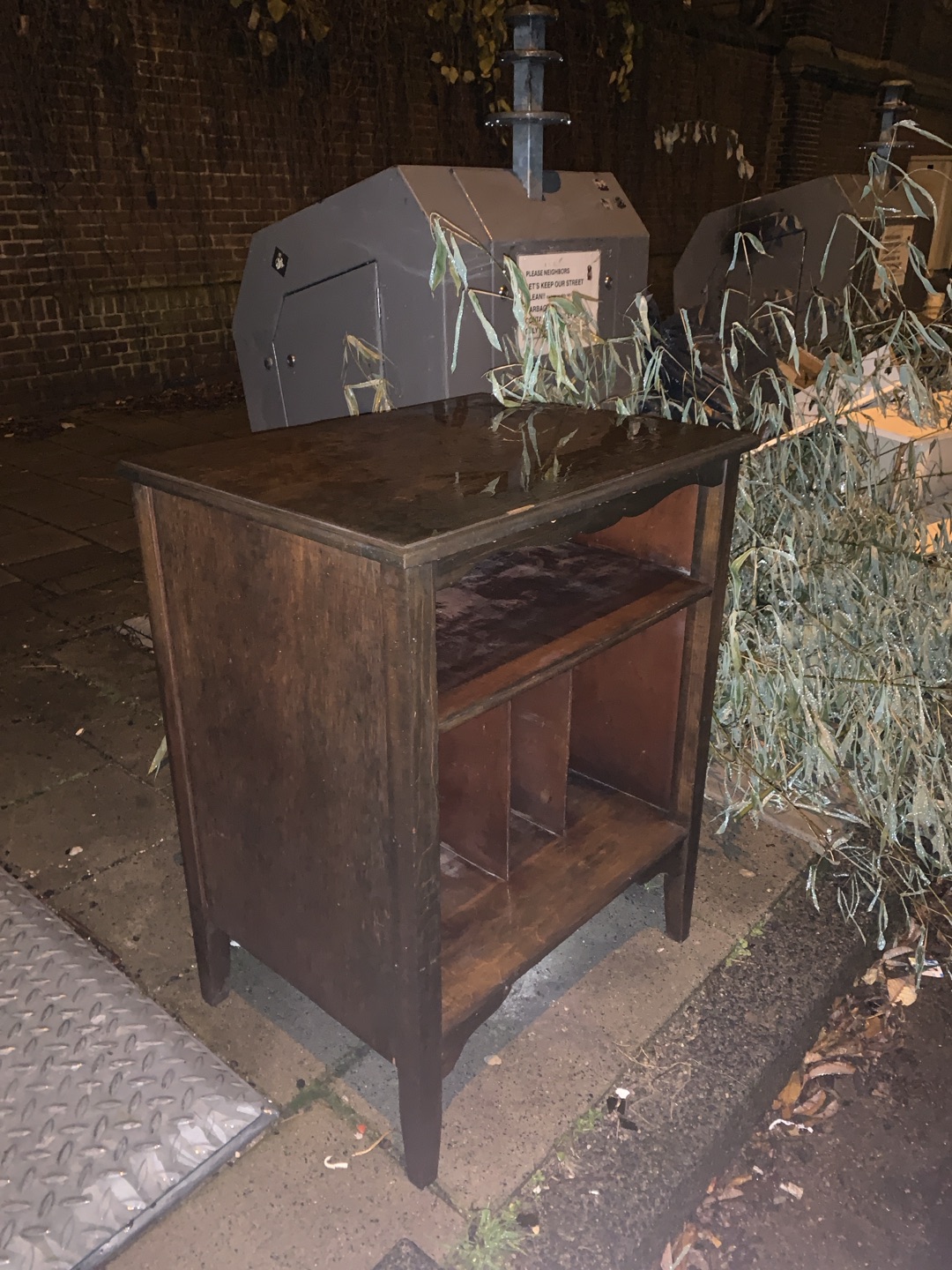Wooden old school desk. Is not heavy and can be detached in the seperate compartments without undoing screws or anything into 2 seperate side closets and the top desk. Has a sign free to take
