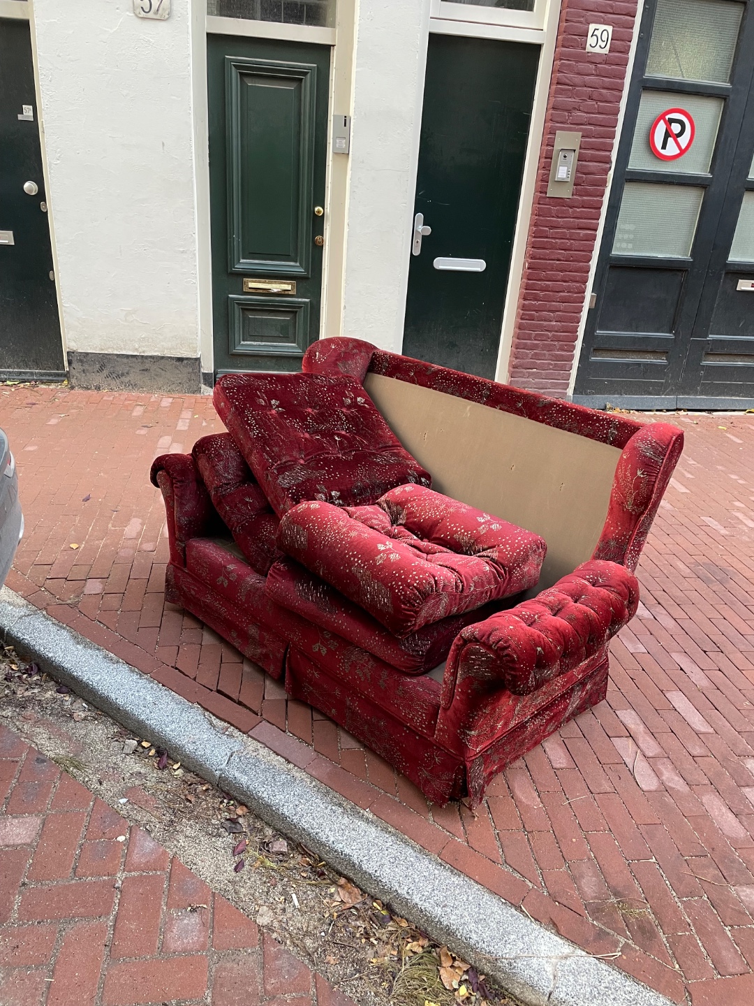 Gespot bij het grofvuil: Chesterfield (achtige) bank helaas zonder kussen. Helaas kunnen we 'm niet meenemen. Wie vindt dit een leuk project? 🙂 Lokatie: ter hoogte van Dierenriem 25 in Amsterdam Noord.