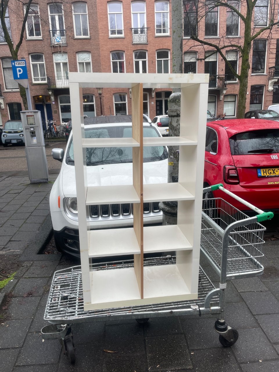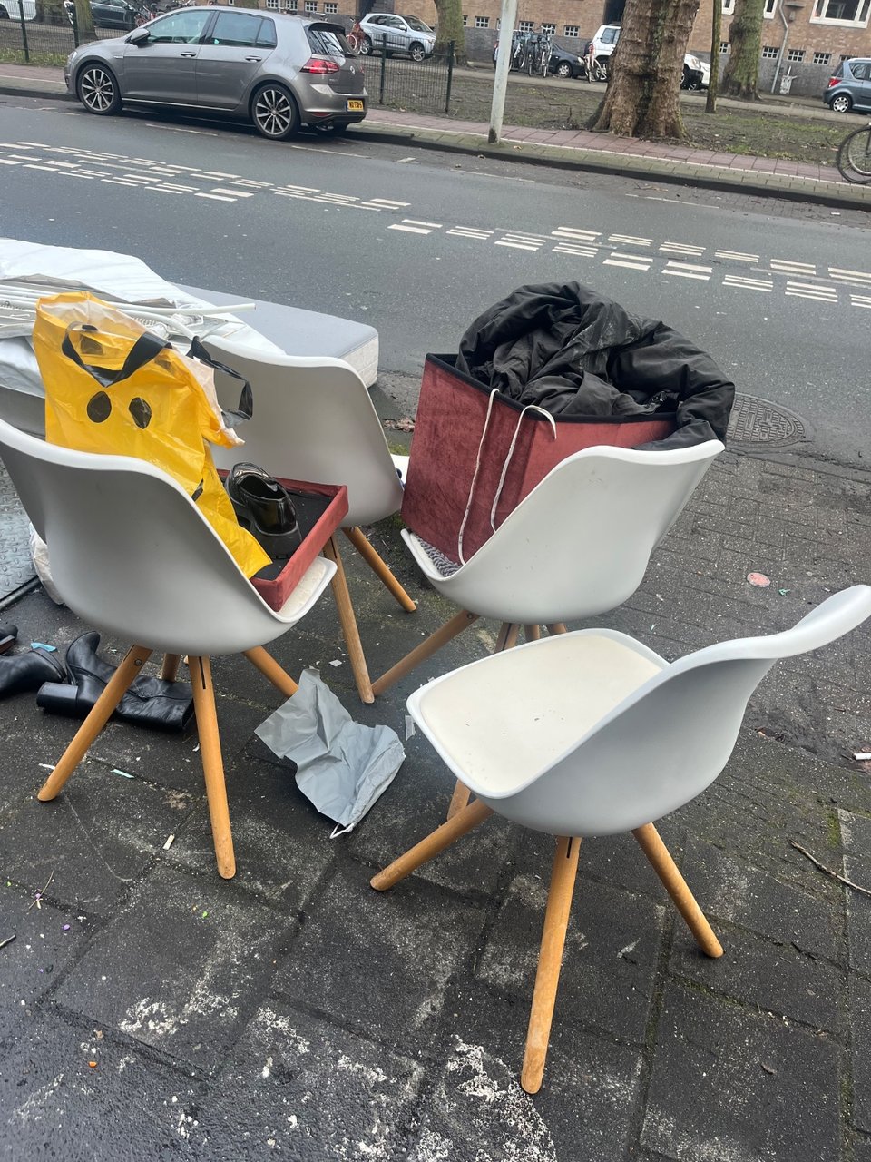Nog helemaal goede meubels. IKEA Billy, bureau, stoelen, Zelfs een Dyson, moet wel vaak opgeladen worden. En een kratje vol met goede flessen wijn.