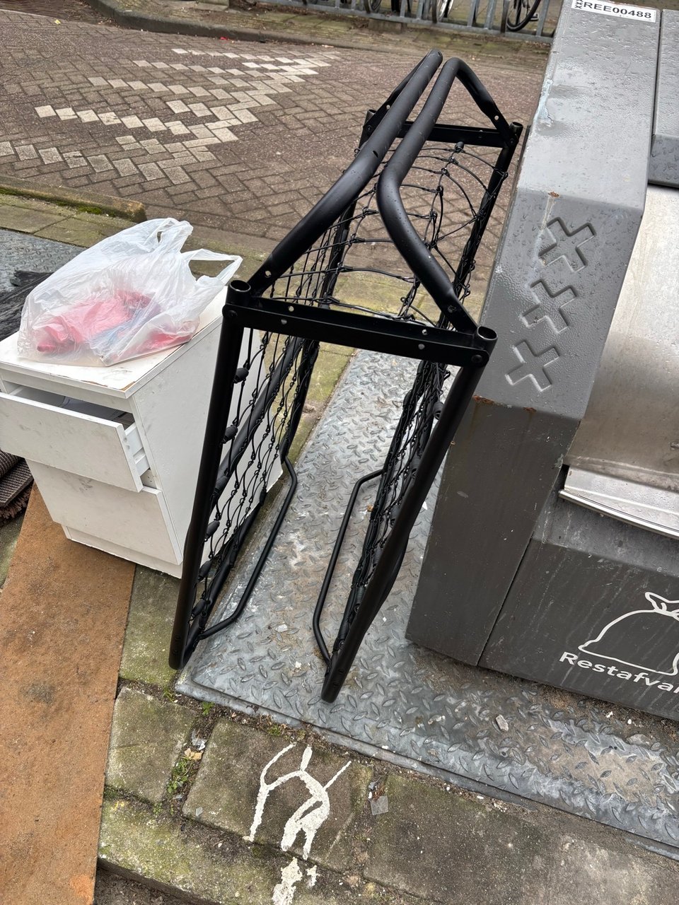 Schommelstoel in goede staat qua constructie, heeft wel een likje verf nodig. nachtkastje ook gebruikt, maar nog bruikbaar, en hanglamp in goede staat. Er staat ook nog een oude grote prullenbak, zilverkleurige, waarvan de deksel niet meer goed sluit. Vanavond vanaf 21u zet ik het buiten!