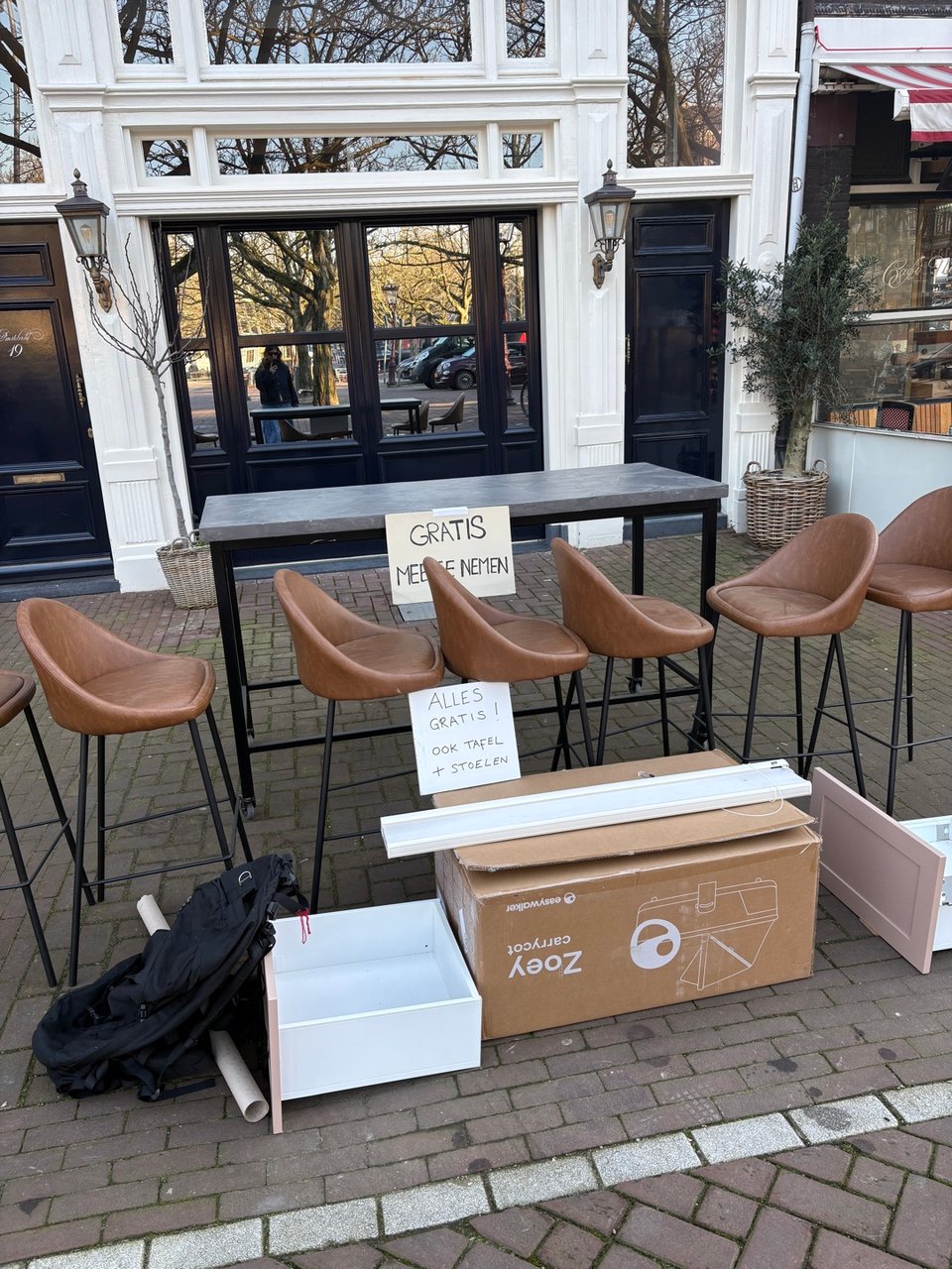 Table, high chairs, curtain. Box of pram is empty.