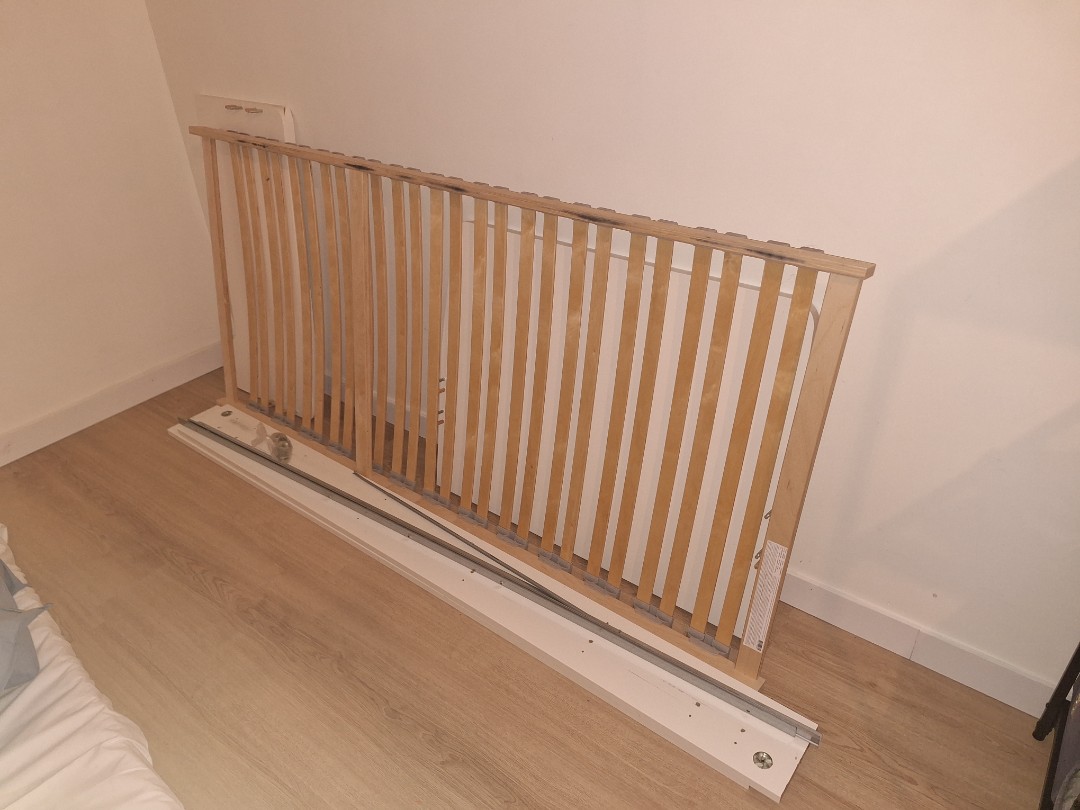 Pallet en twee eenpersoons lattenbodems. 17:40.