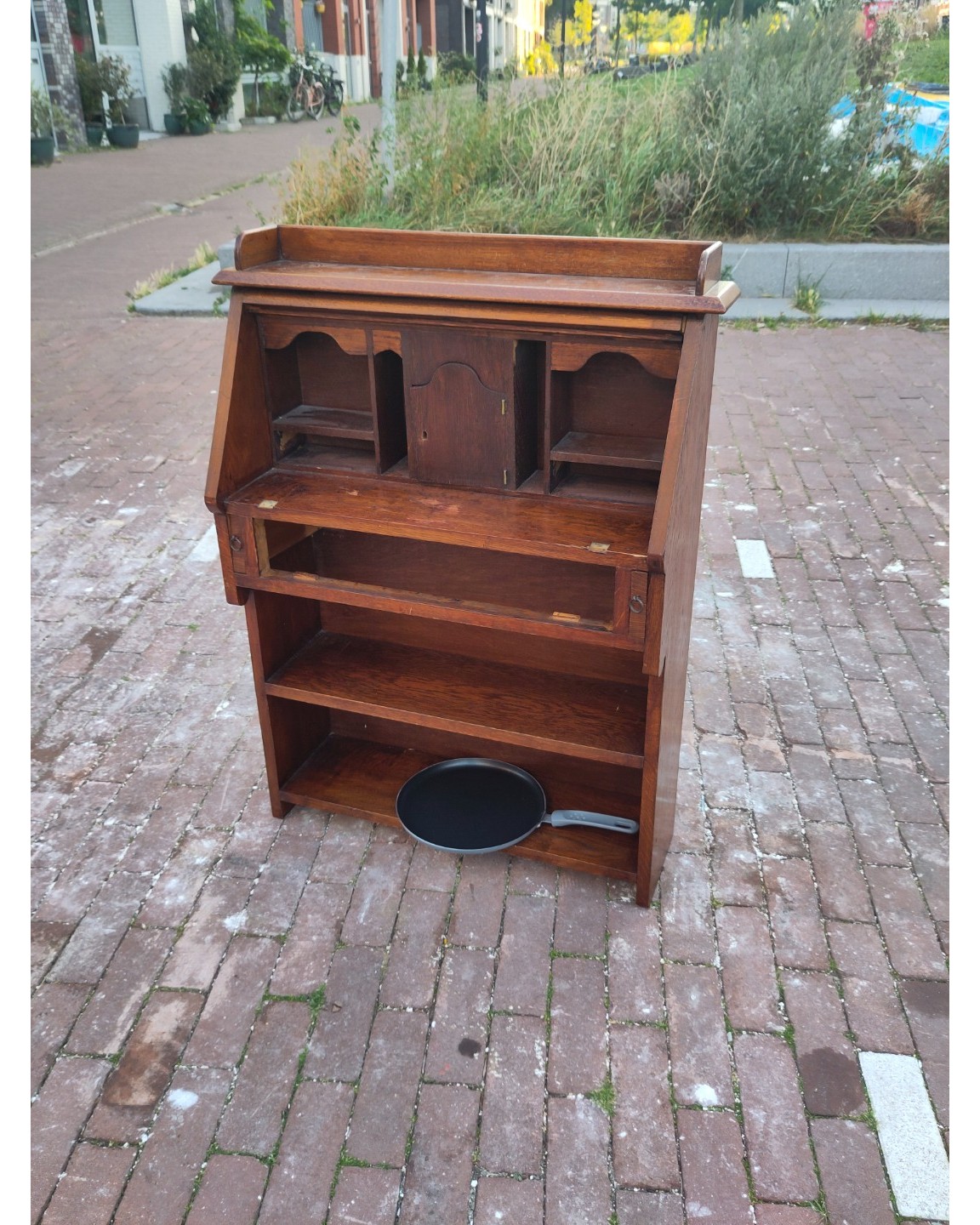 Really nice solid wood and metal half moon table, maybe like 50/60ish cm wide. Pretty heavy.