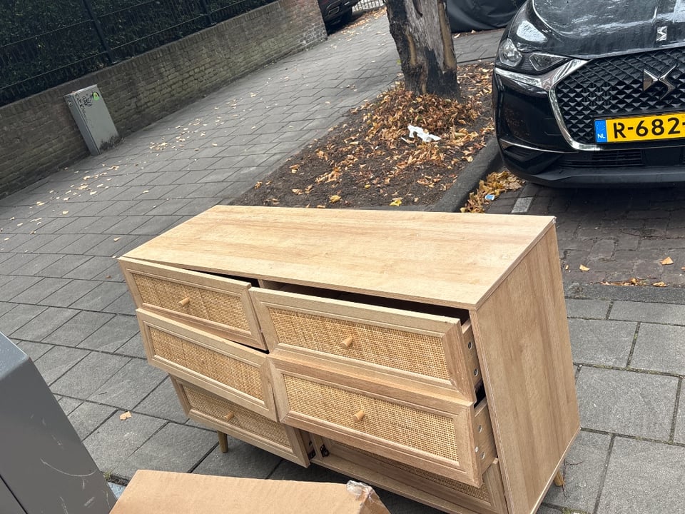 Ladekastje eiken/beuken fineer, bekleed met rotan op de lades vintage look alike